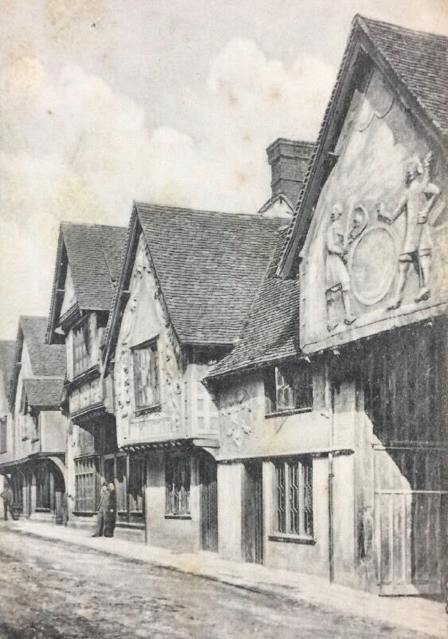 plasterwork, or 'pargetting', on its facade, depicting the legendary figures